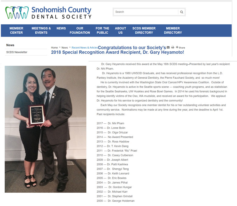 In May 2018, Dr. Gary was named Snohomish County Dental Society's Special Recognition / Dentist of the Year Award for voluntary community service. Pictured is 2017 award recipient Dr. Nhi Pham presenting the recognition plaque.