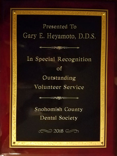 In May 2018, Dr. Gary was named Snohomish County Dental Society's Special Recognition / Dentist of the Year Award for voluntary community service. Pictured is 2017 award recipient Dr. Nhi Pham presenting the recognition plaque.
