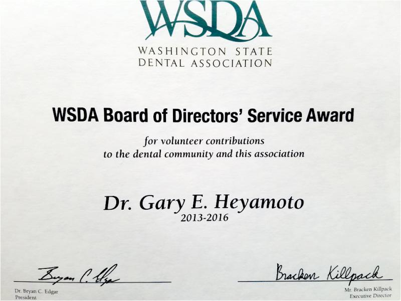 Dr. Heyamoto completed his year (2009-2010) as Chairman of the Budget/Finance Committee of the Washington State Dental Association by delivering the financial report to the House of Delegates in September. He then ran for and was elected to a three year term as a member of WSDA Board of Directors.