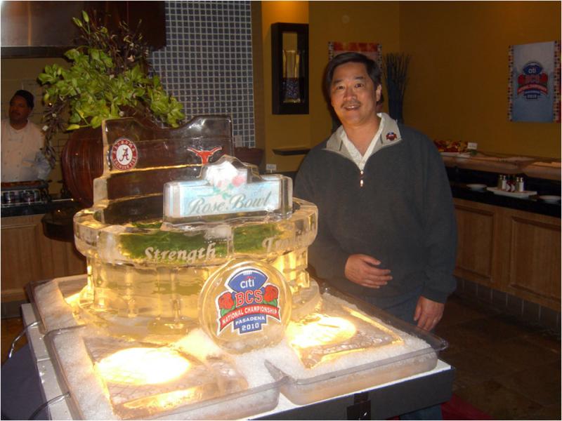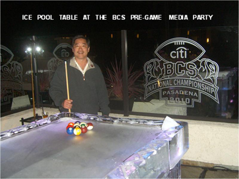 An ice pool table and an ice Rose Bowl sculpture could be found at the BCS pregame media party.