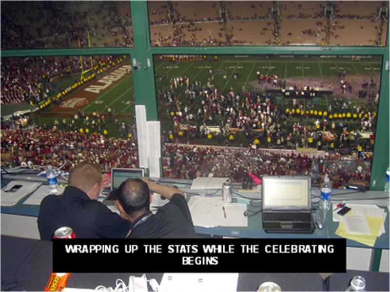 My brother, Craig, and SPU's Dan Lepse send final statistics electronically as Alabama celebrates after winning the 2010 BCS National Championship.